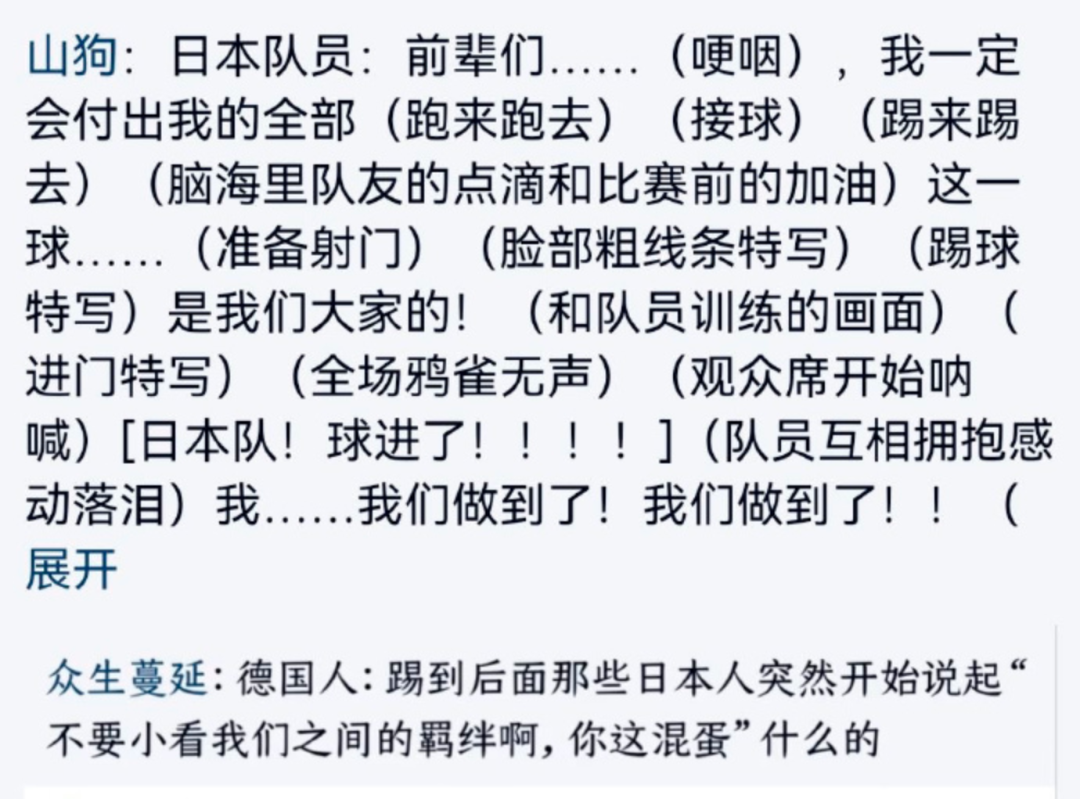 日本赢德国的时候有人调侃,以后日本队的实力,必须得把什么友情啊、羁绊啊考虑进去。