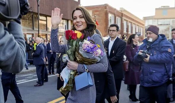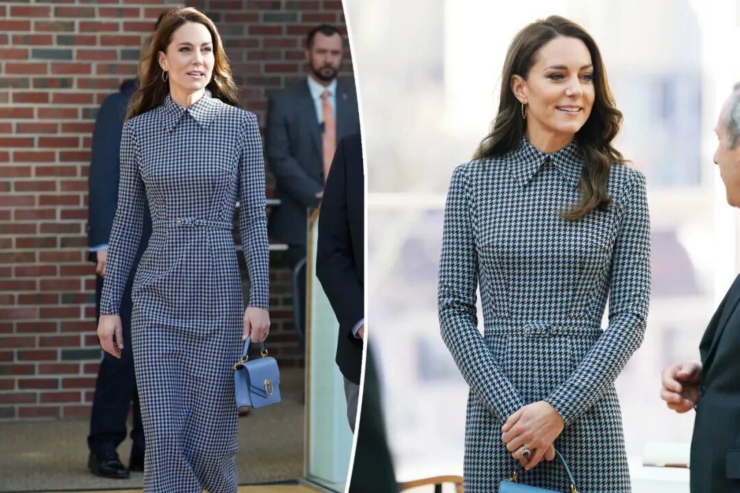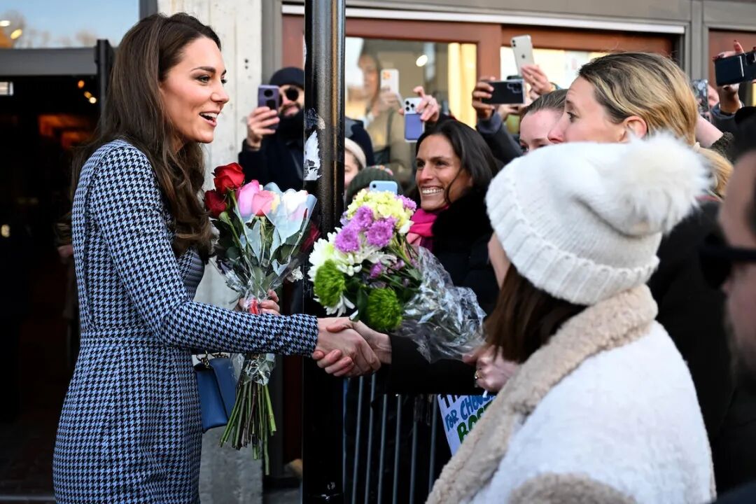 凯特当天穿着一件海军蓝的千鸟格连衣裙,优雅得体,在现场受到了“我们爱你凯特”标语的欢呼迎接。