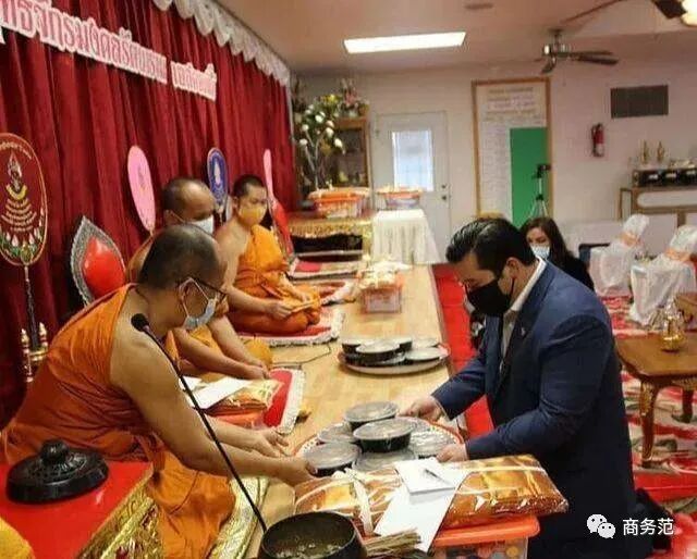 那边泰王携女眷到玉佛寺参加纪念活动,这边他就在美国的寺庙举行私人供奉活动,隔空cue泰王。