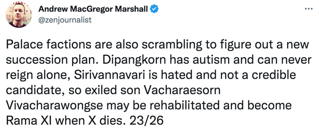 再联想到“王室专家”马歇尔之前的推文:“宫廷派系正在争先恐后地制定新的继任计划。提帮功患有自闭症,永远不能单独统治,思蕊梵公主人望太低,不是可靠候选人,只有流放海外的二儿子可能会被召回,在泰王之后继位成拉玛十一世...”