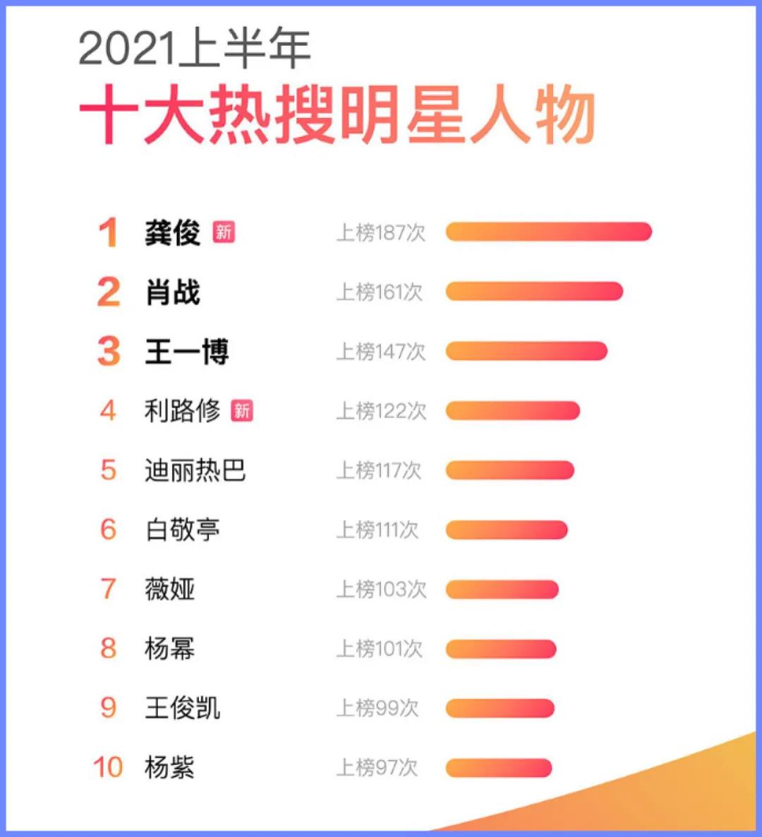 數據顯示,在2021上半年熱搜人物榜單中,龔俊以187次位列第一,換算一下,平均每天他都會在熱搜榜上成為大家的吃瓜對象,而就連排名第10位的楊紫,每1.8天也會與大家在熱搜榜上相見。