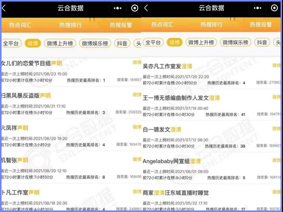 遇到危機了,熱搜是個很不錯的發聲場所,明星們會對某些消息和言論發起“澄清”和“聲明”,緊接著而來的是撤熱搜和封鎖詞條等等。