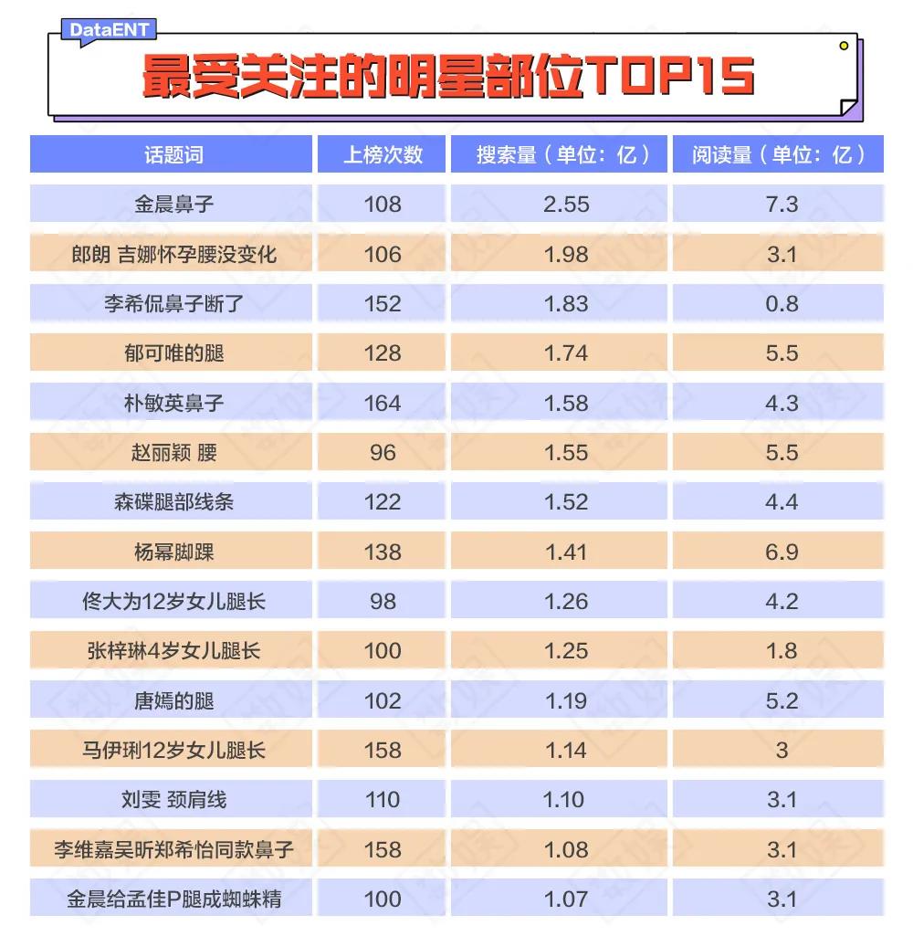 在所有關注明星部位的熱搜中,top15的話題詞搜索量均超過1億,超過5億的閱讀量的為#金晨鼻子#、#楊冪腳踝#與#唐嫣的腿#。而金晨除了鼻子這個部位很有熱度以外,她的#金晨給孟佳P腿成蜘蛛精#搜索量也位居第15位,成為唯一上榜2次的藝人。