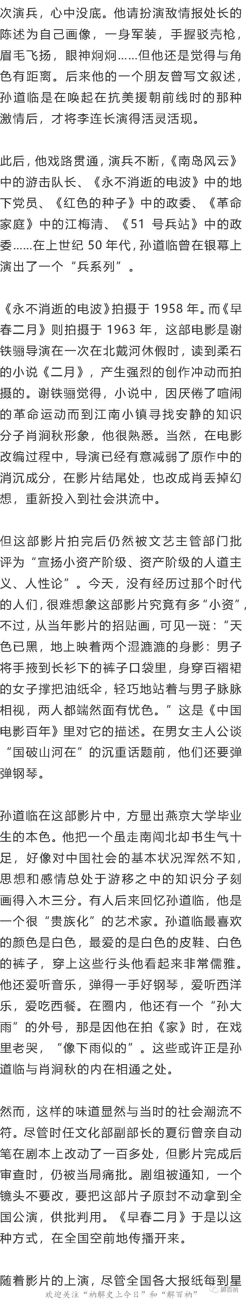《早春二月》中的肖澗秋,那才是孫道臨的招牌形象,不知賺得了多少女性觀眾的眼球。在上世紀60年代,上海電影製片廠的孫道臨與八一電影製片廠的王心剛,並稱中國電影界的兩大當紅英俊小生。