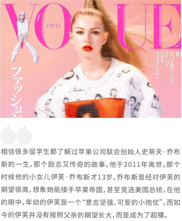 在日本版《VOGUE》的10月刊封面上,我们见到了一张略显陌生的年轻面孔,她的名字叫伊芙·乔布斯。