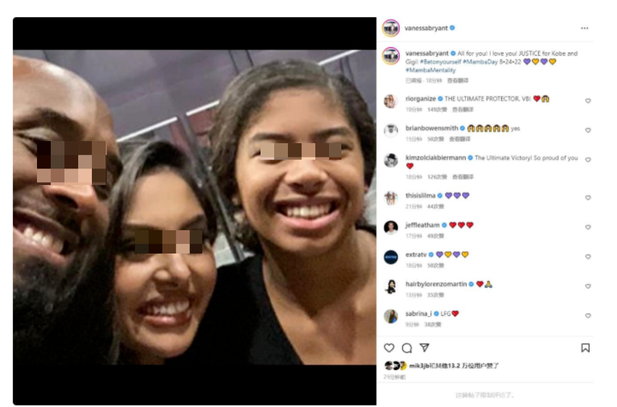 近日,瓦妮莎在社交平台晒出了与科比&GIGI的合照,并写道: