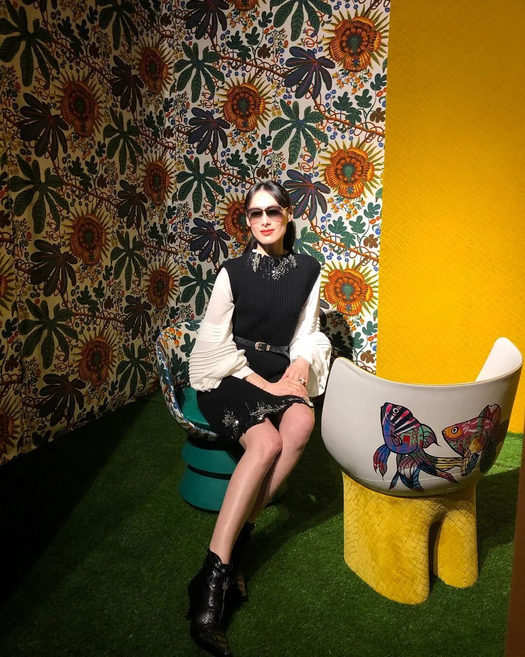 参加路易威登活动这一身又比较贵妇,LV宫廷风真丝衬衫外搭针织亮片裙,飞行员墨镜室内都舍不得摘下,凹造型也是很拼~