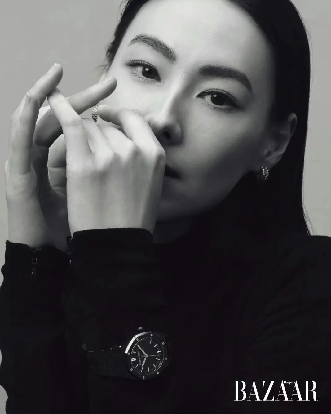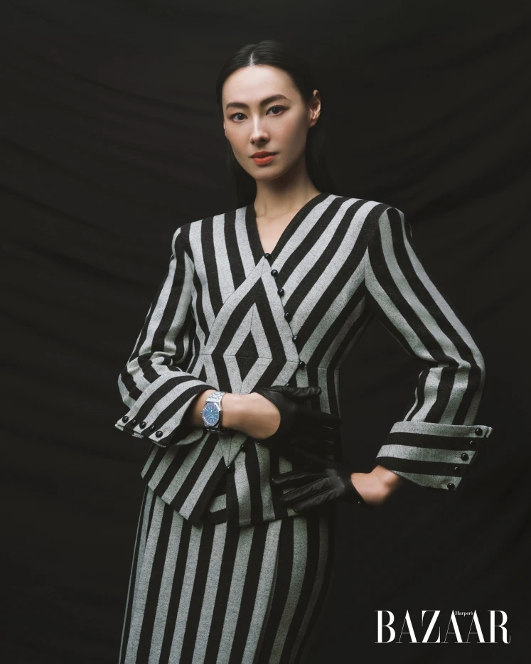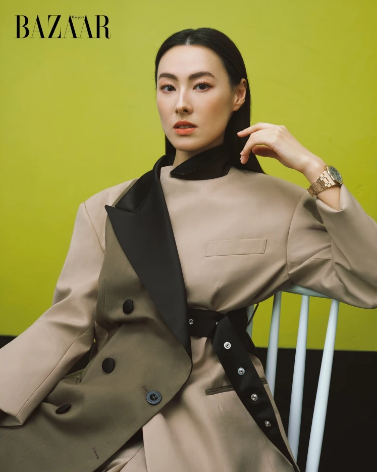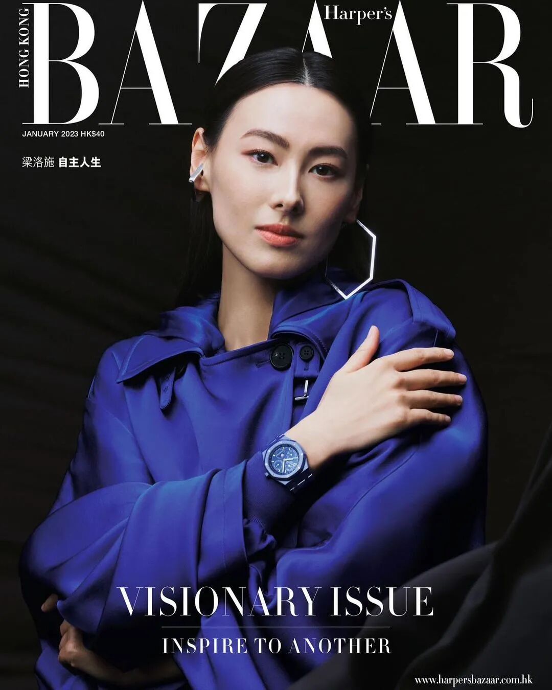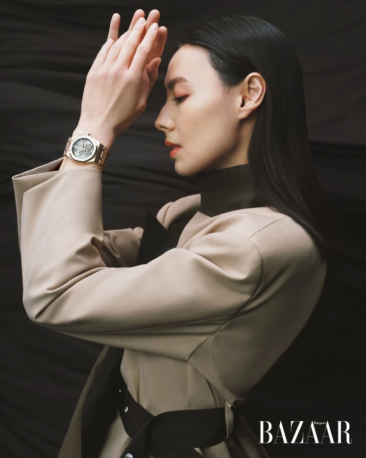电影刚杀青,她就高调登上港版《时尚芭莎》开年刊封面,身穿克莱因蓝Tom Ford斗篷,佩戴同色系爱彼皇橡系列万年历陶瓷腕表,耳畔超大的银色金属耳环来自Gucci,衬得整个人更显英气。