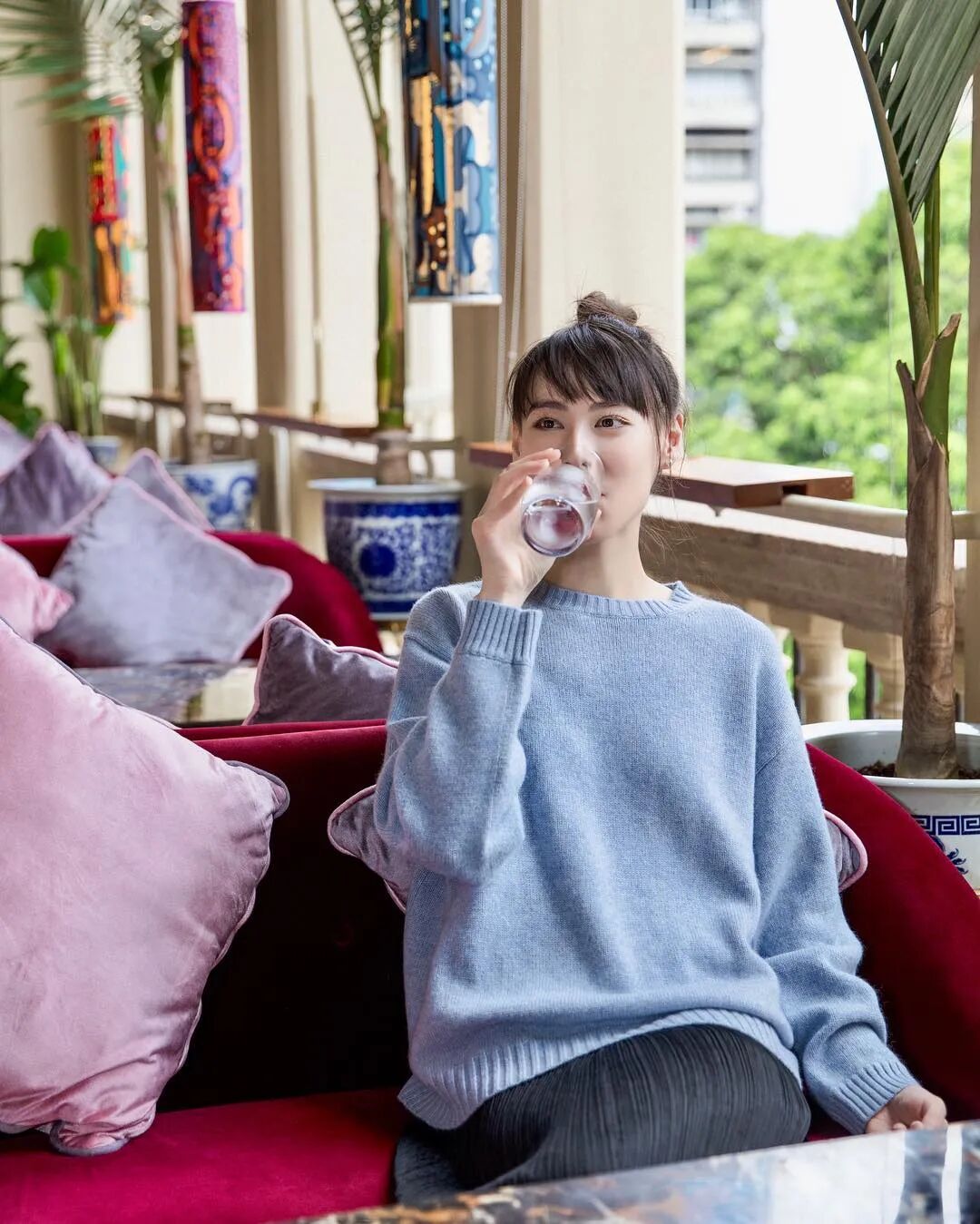 有时候还扎上俏皮丸子头摆拍,Max Mara雾霾蓝羊绒衫和百褶裙的搭配也很减龄。