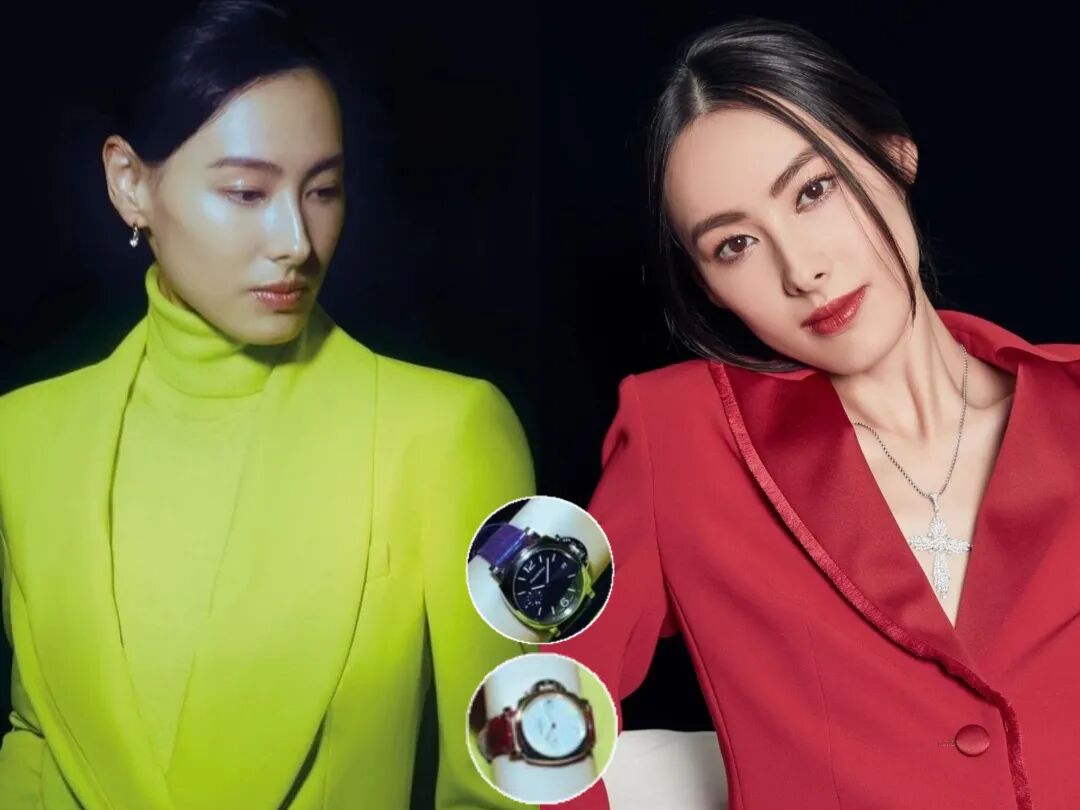 一般人比较难驾驭的彩色西装,在她身上也很合理。左边这身荧光绿套装来自Ralph Lauren,还用小巧的Forever Mark耳环画龙点睛;右边这身正红色Maxmara也很惊艳,胸前硕大的钻石项链来自Qeelin珠宝,腕表都来自沛纳海。