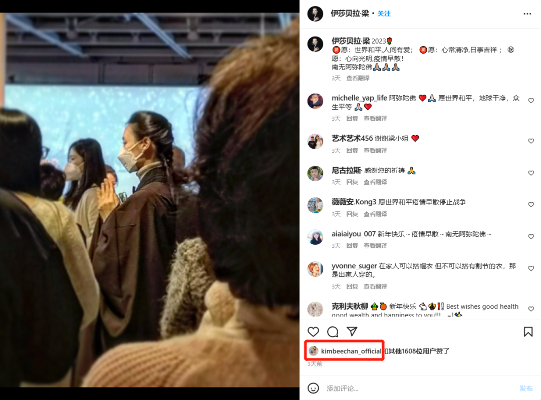 画展当天还有法会分享,梁洛施在ins上晒出了自己身穿海青服,双手合十为新年祈福的照片,“编内”贵妇甘比还给她点赞了。不禁让人想到了在甘露寺修行的甄嬛,不知道现实中“熹妃回宫”的情节会不会上演呢?