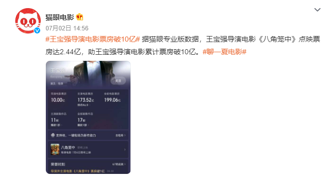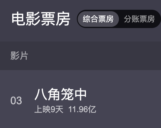 根据@猫眼电影的数据统计,截至发稿前,《八角笼中》的电影累计票房已经突破了11.96亿元人民币。