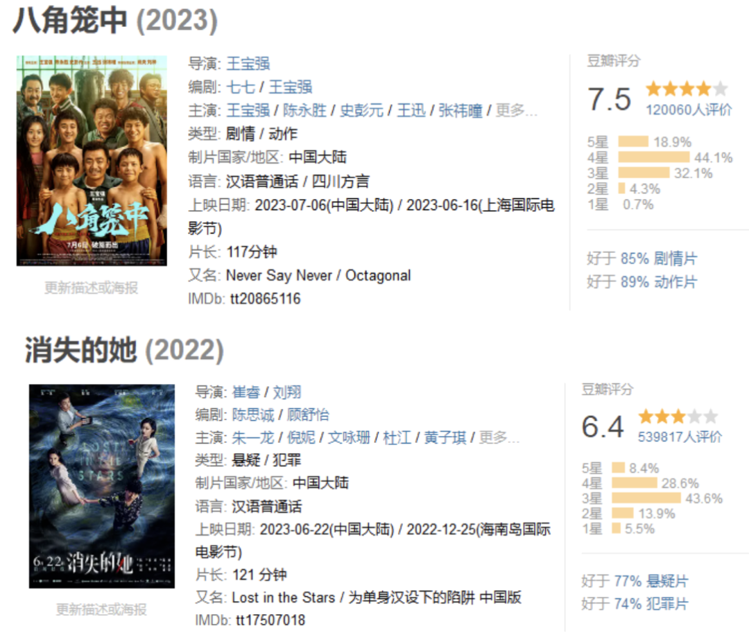 《八角笼中》目前在豆瓣网站上的评分保持在7.5分上下,超过最近的大热门《消失的她》整整1分还多。