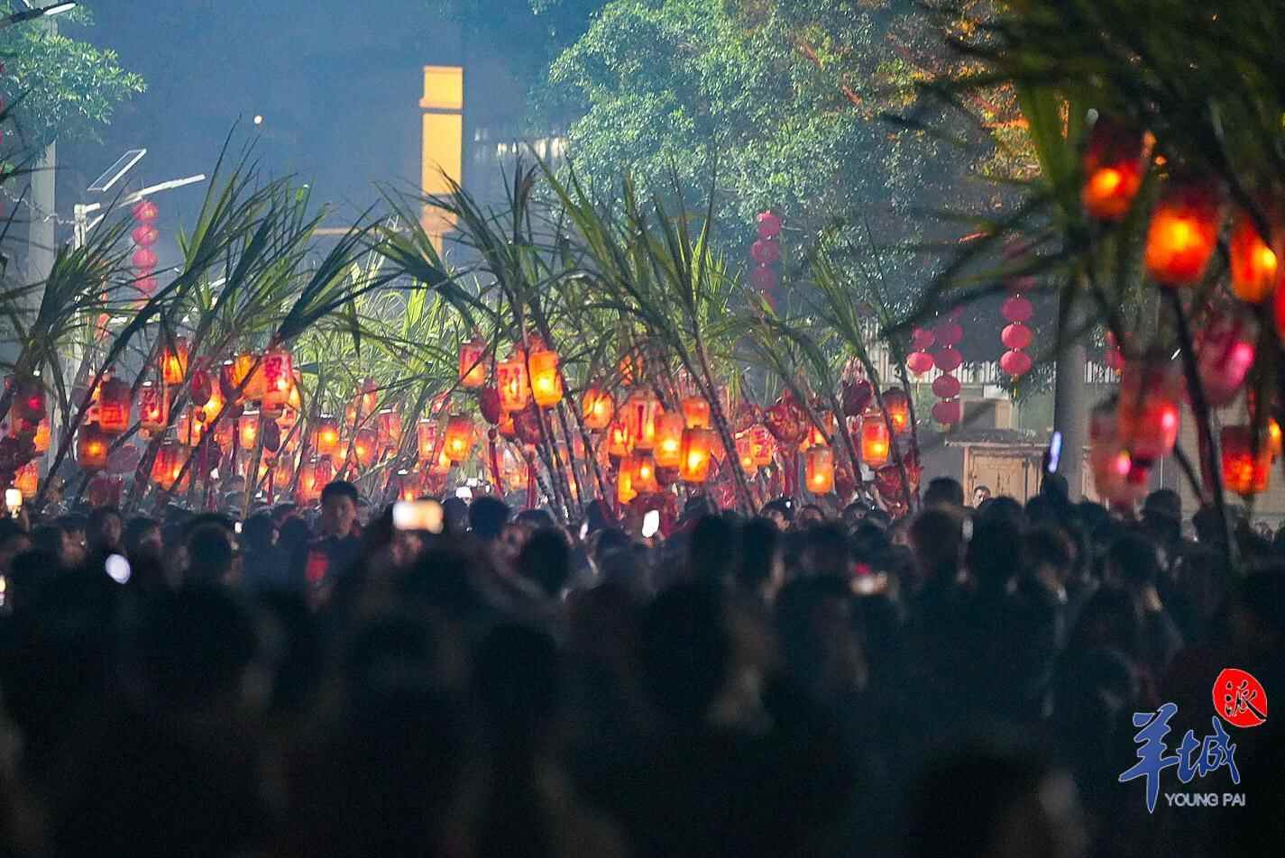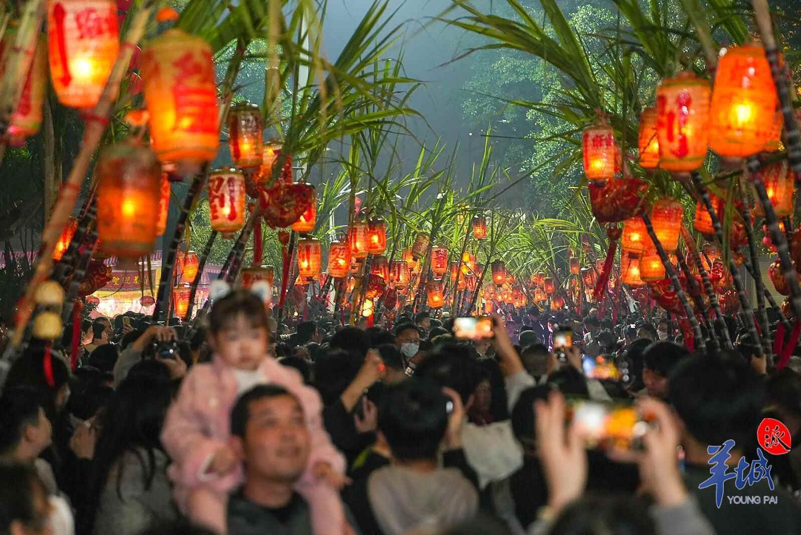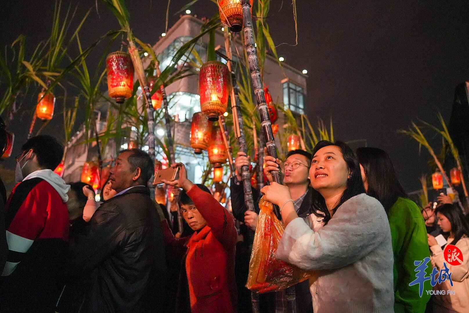#老广贺春#NewYearinLingnan With the gong music playing in the background and lanterns shining high above the sugarcane,a traditional folk cultural activity titled"Sugarcane Lane"was held in Xikou village,Xiangqiao district,Chaozhou city on February6.