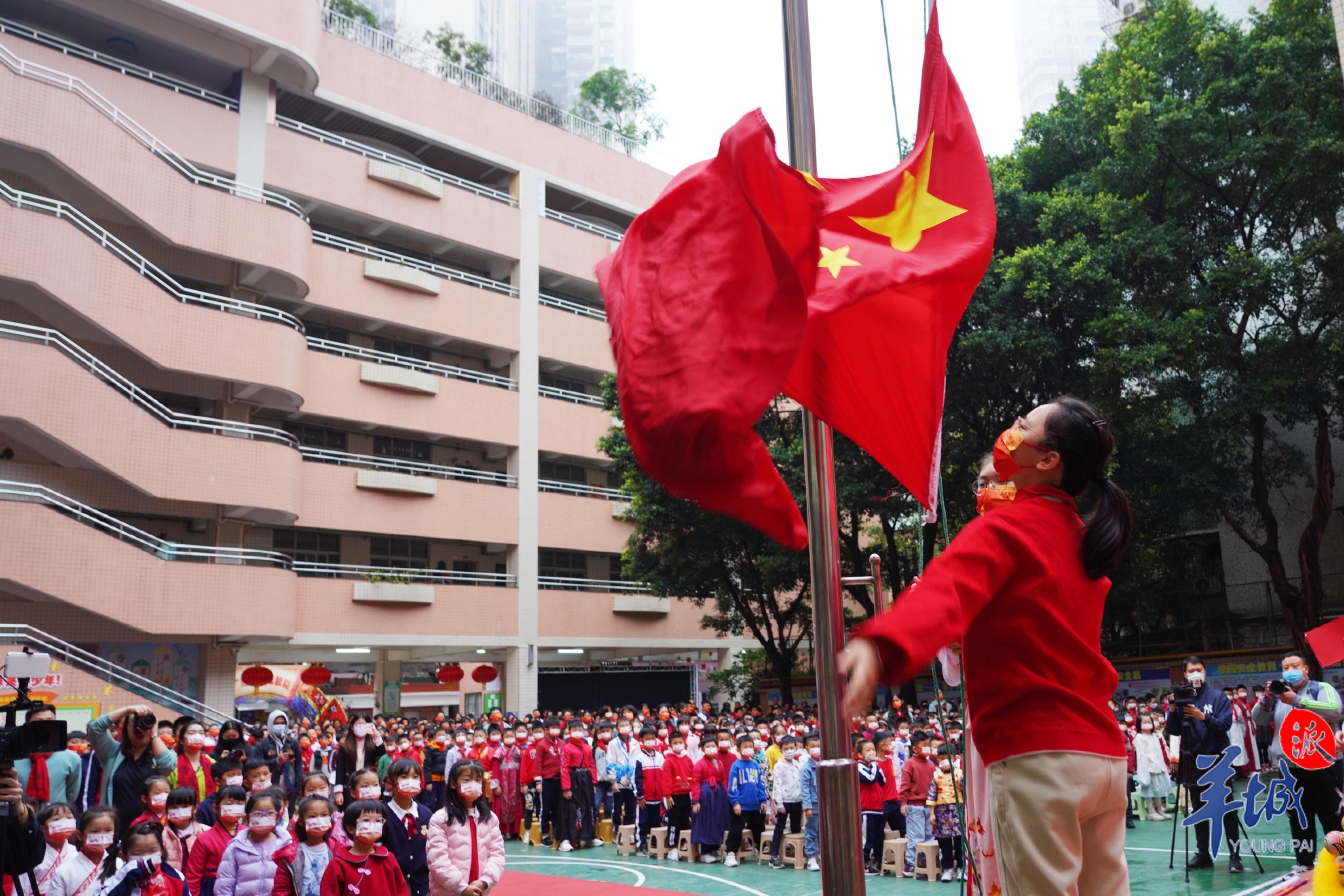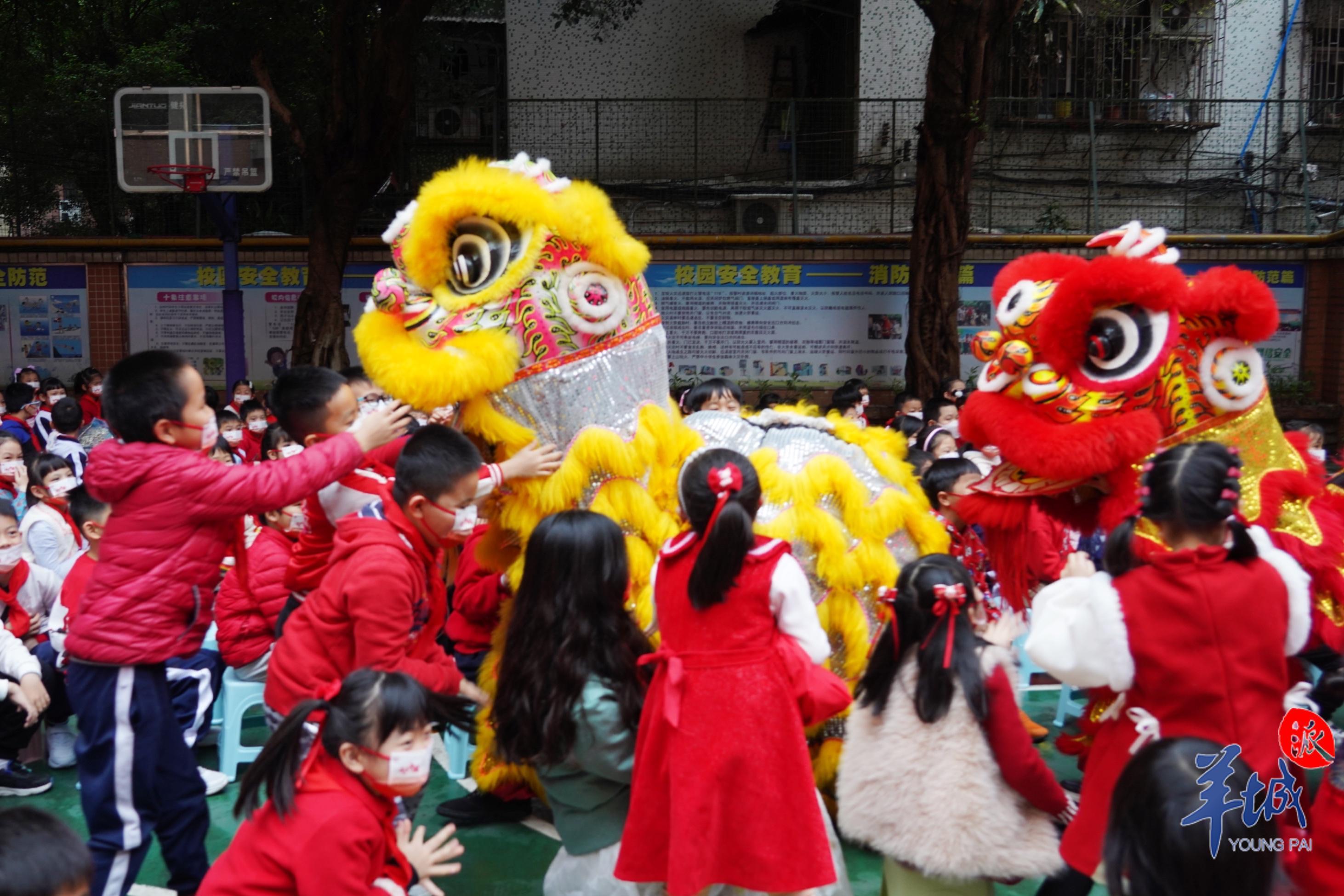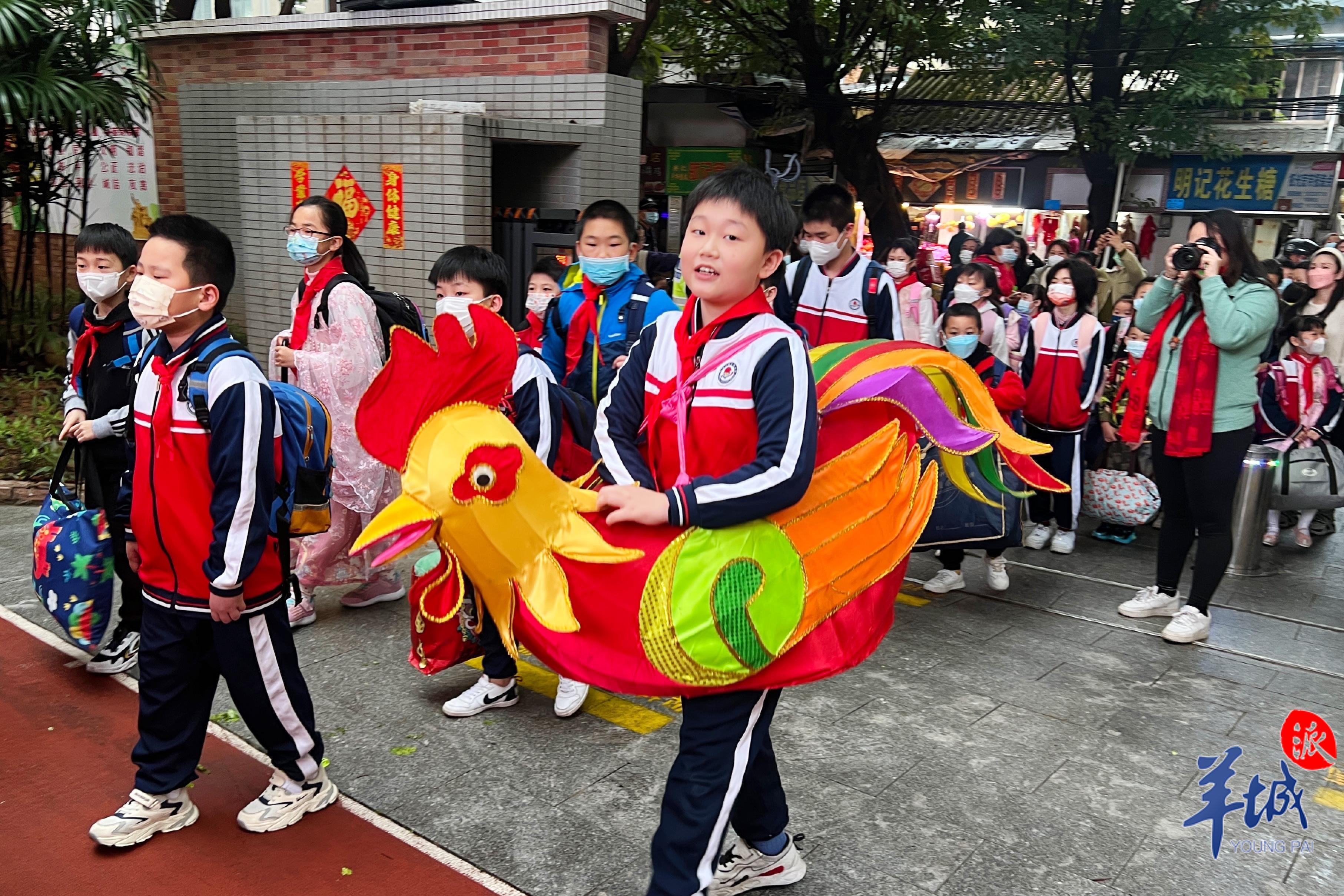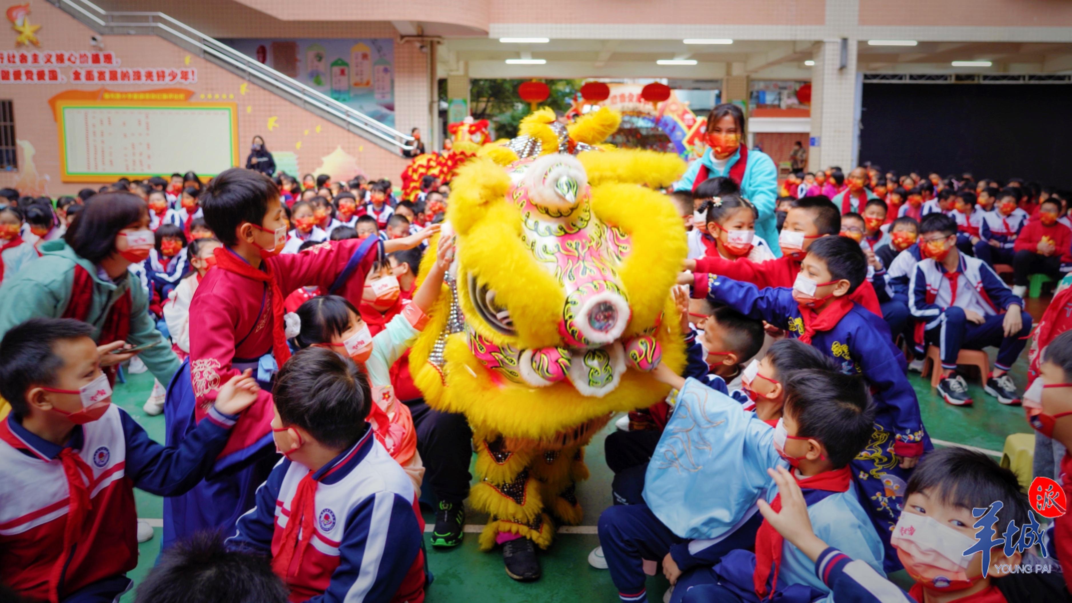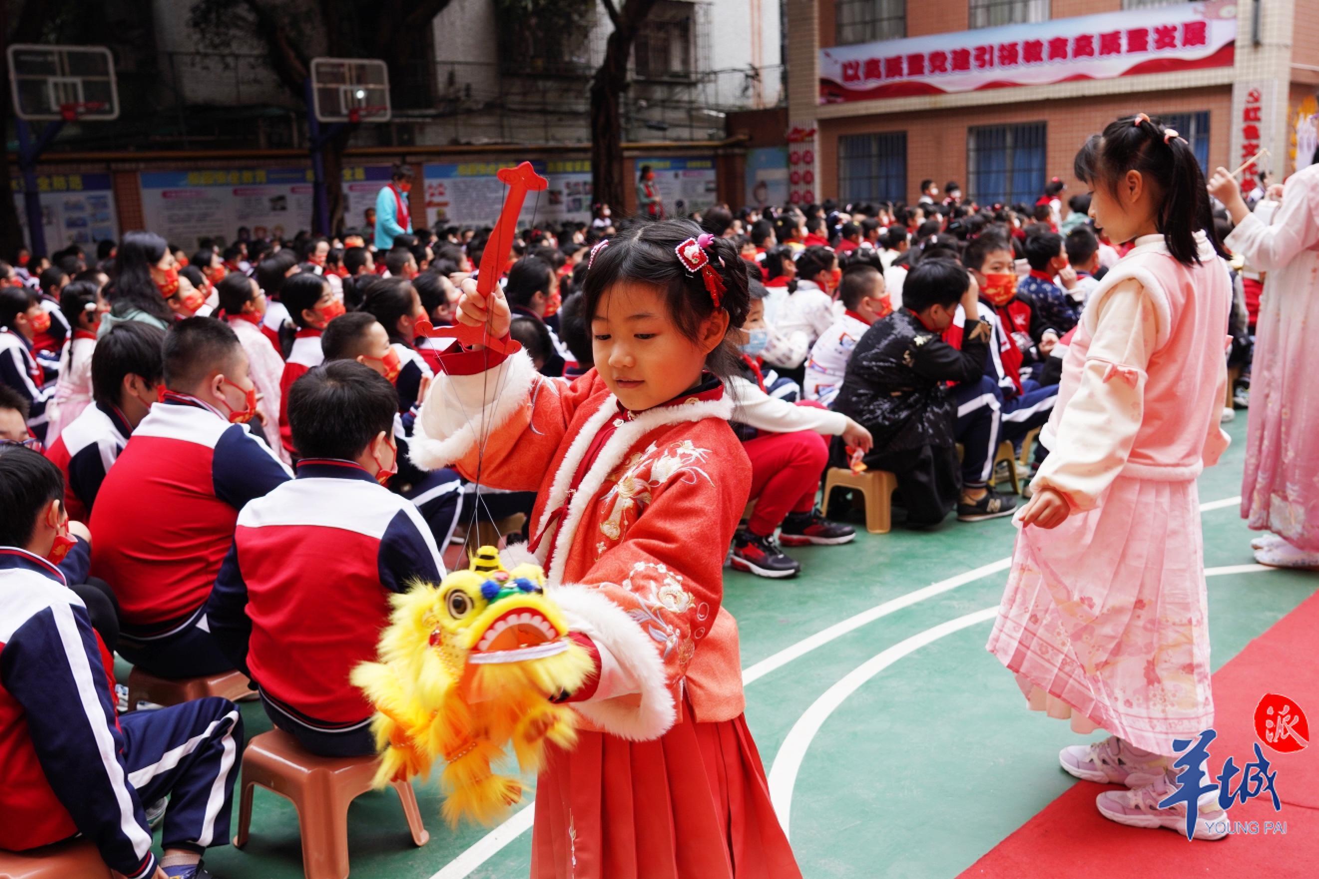 作为广府庙会校园分会场,广州珠光路小学在开学典礼上准备了醒狮献瑞、猜灯谜等传统民俗文化活动。
