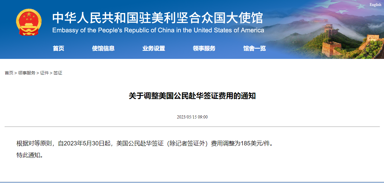 根据对等原则,自2023年5月30日起,美国公民赴华签证(除记者签证外)费用调整为185美元/件。