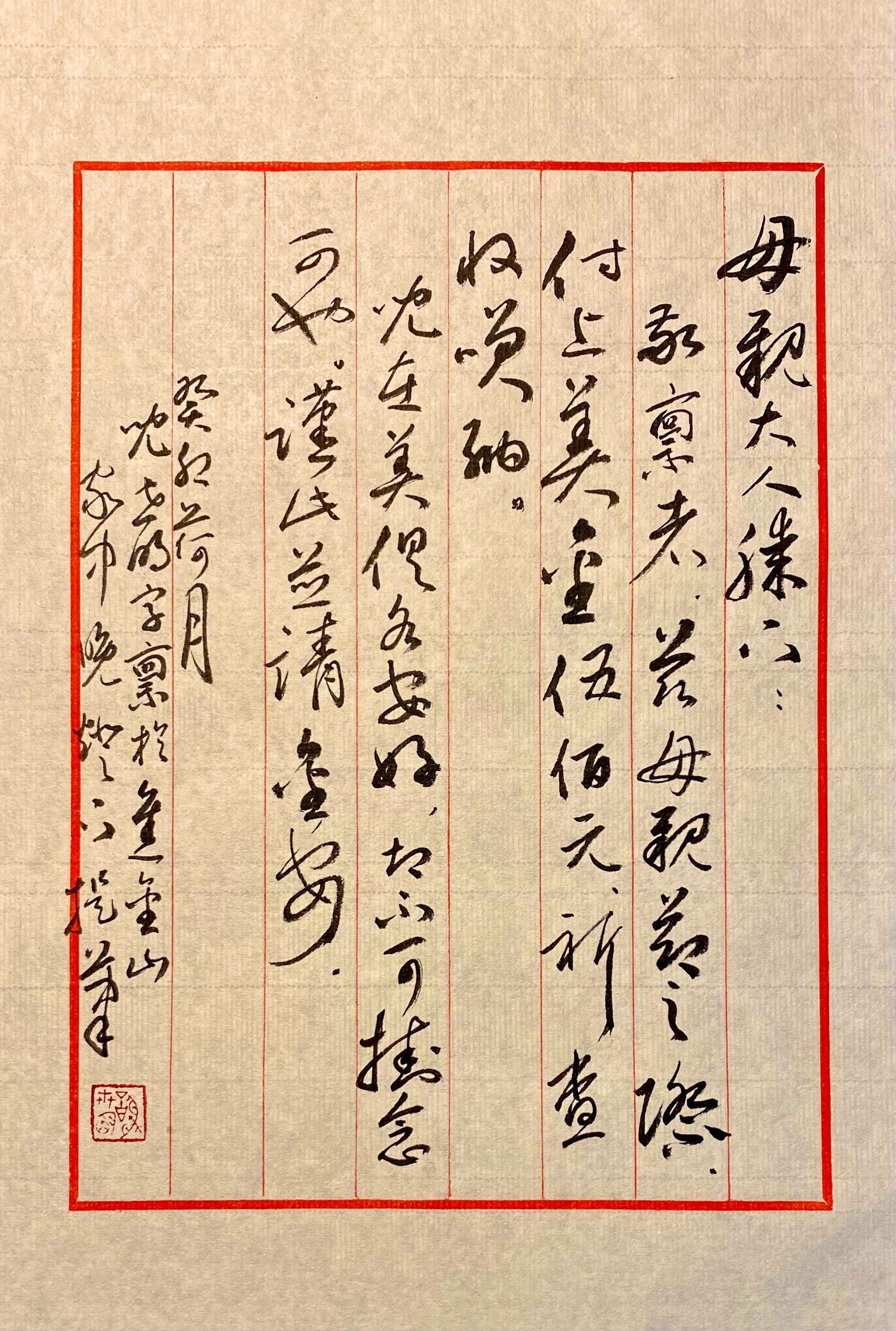 “现在是高科技的年代,大家都是用微信电脑操作。但是我讲句实话,我短短的几十个字,写在一张信纸上,这是我的真情流露,是电脑做不到的。”谢世明对手写侨批信件的形式非常珍视,“每一张艺术作品都有唯一性,你让我重新写一张都写不出来。为什么?因为当时那种环境,和作者那种心情,是融为一体的。”“每个人电脑上的字都是四四方方的。但是我亲手写下这个作品,又盖印子到上面。妈妈一看到会觉得‘哦,这是我儿子亲手写给我的’。”