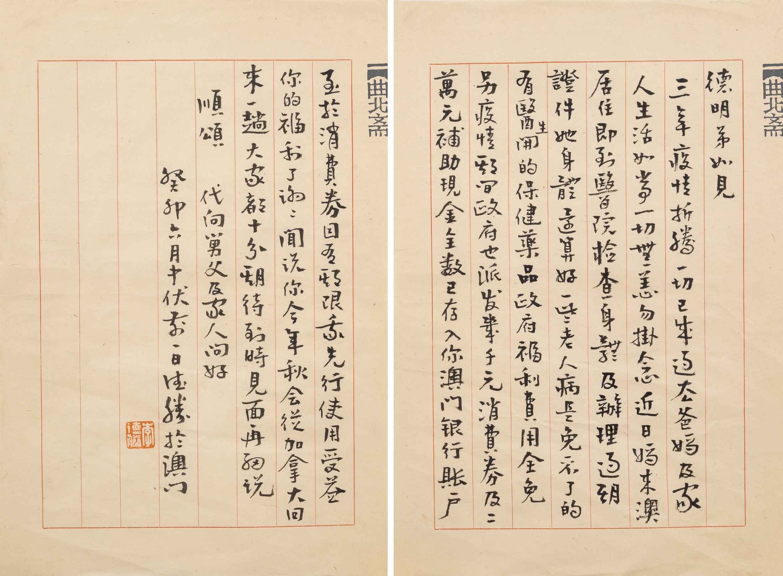 李得之说,二弟远隔重洋,常常三五年不回国。因为疫情,他跟母亲也已经三年没见了,直到今年才接母亲到澳门暂住。在给二弟的信中,他写到带母亲去医院做体检的事情:“她身体还算好,一些老人病是免不了的。有医生开的保健药品,政府福利费用全免。”