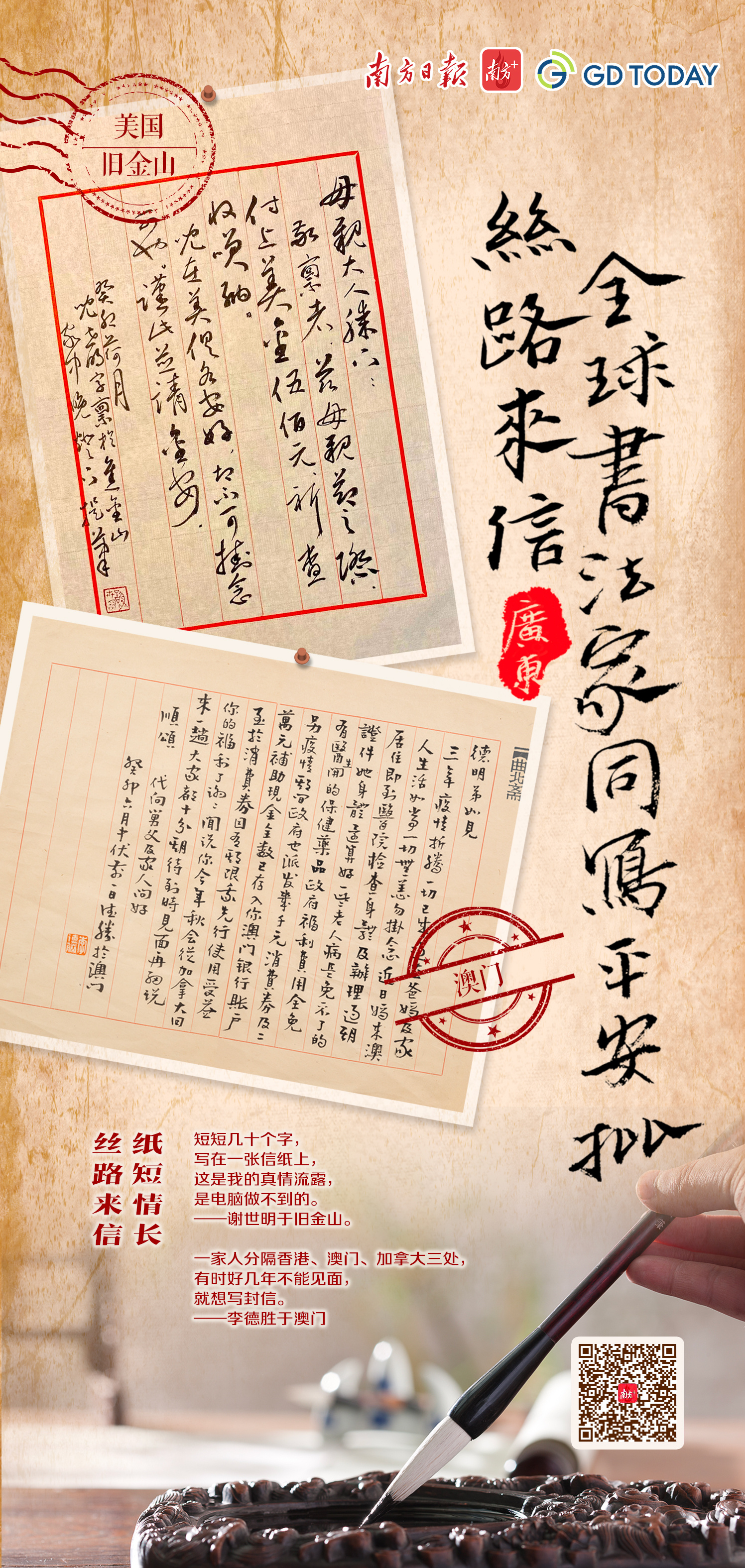 在“一带一路”倡议提出十周年、“侨批档案——海外华侨银信”入选《世界记忆名录》十周年之际,日前,南方日报、南方+、GDToday发起“丝路来信·全球书法家同写平安批”征集活动。两周内,便收到来自中国、美国、西班牙、葡萄牙、加拿大、泰国、马来西亚、新加坡、日本、巴西、阿联酋等国家和地区符合要求的新侨批近100封。