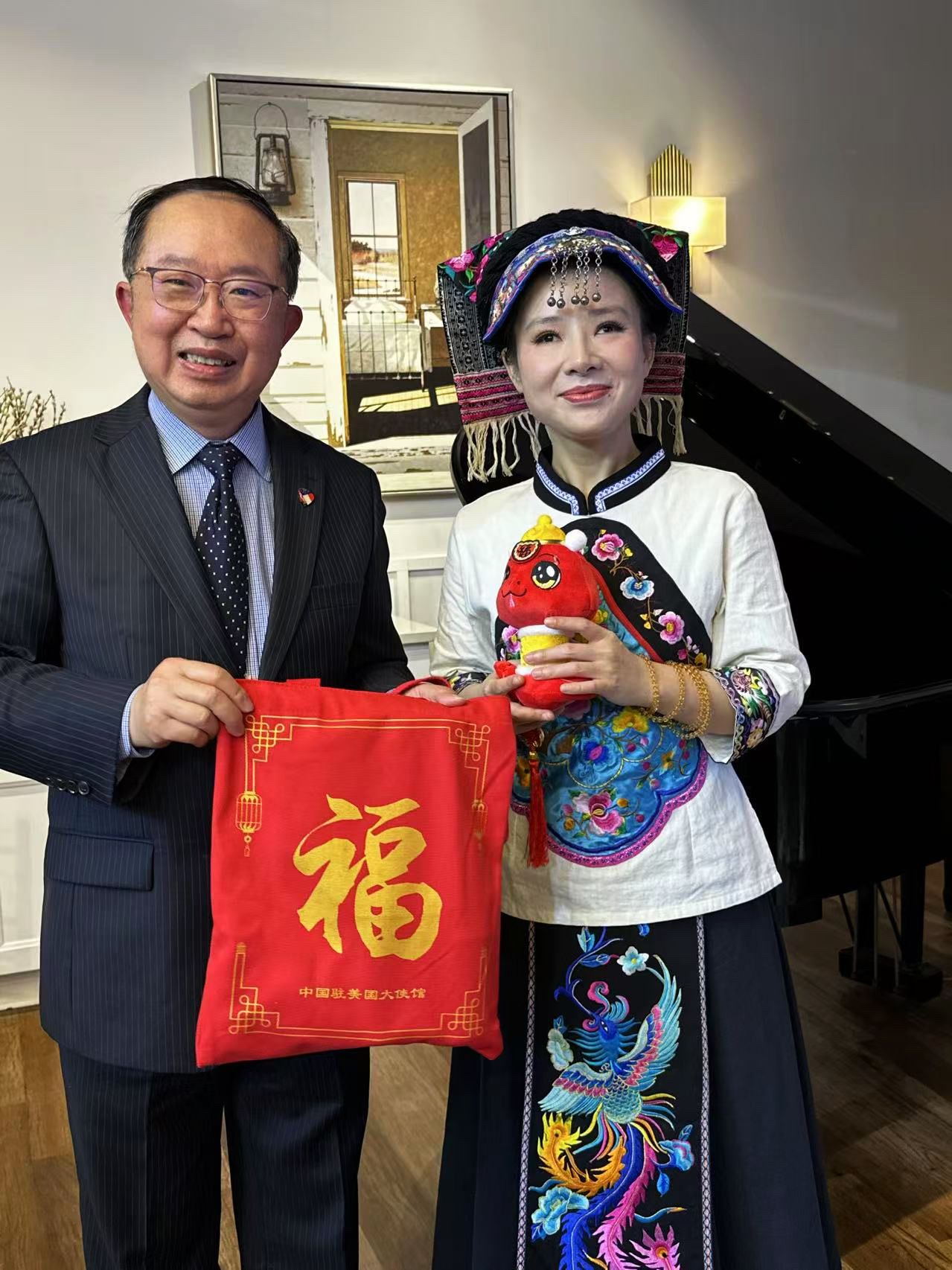 刘赛感动不已,在歌迷的掌声与祝福中吹灭蜡烛,许下心愿。临湘嫂子代表家乡亲人表达了对刘赛的感谢和祝福。美中报道传媒集团江维社长,特向刘赛赠送来自中国驻美大使馆的蛇年生肖礼物等(图Paul Hu)。ACP理事醒醒准备了贺卡,铁粉孙阿姨更是特意准备了一大袋巧克力。粉丝们的深情厚谊让整个会场沉浸在温馨的氛围中。刘赛感动之际,用山泉般的歌声唱出刘三姐的名曲“多谢了!多谢四方众乡亲!我家没有好茶饭,只有山歌待亲人,待亲人。”亚城刘赛粉丝会在悠扬高亢的壮族山歌中完满落幕。
