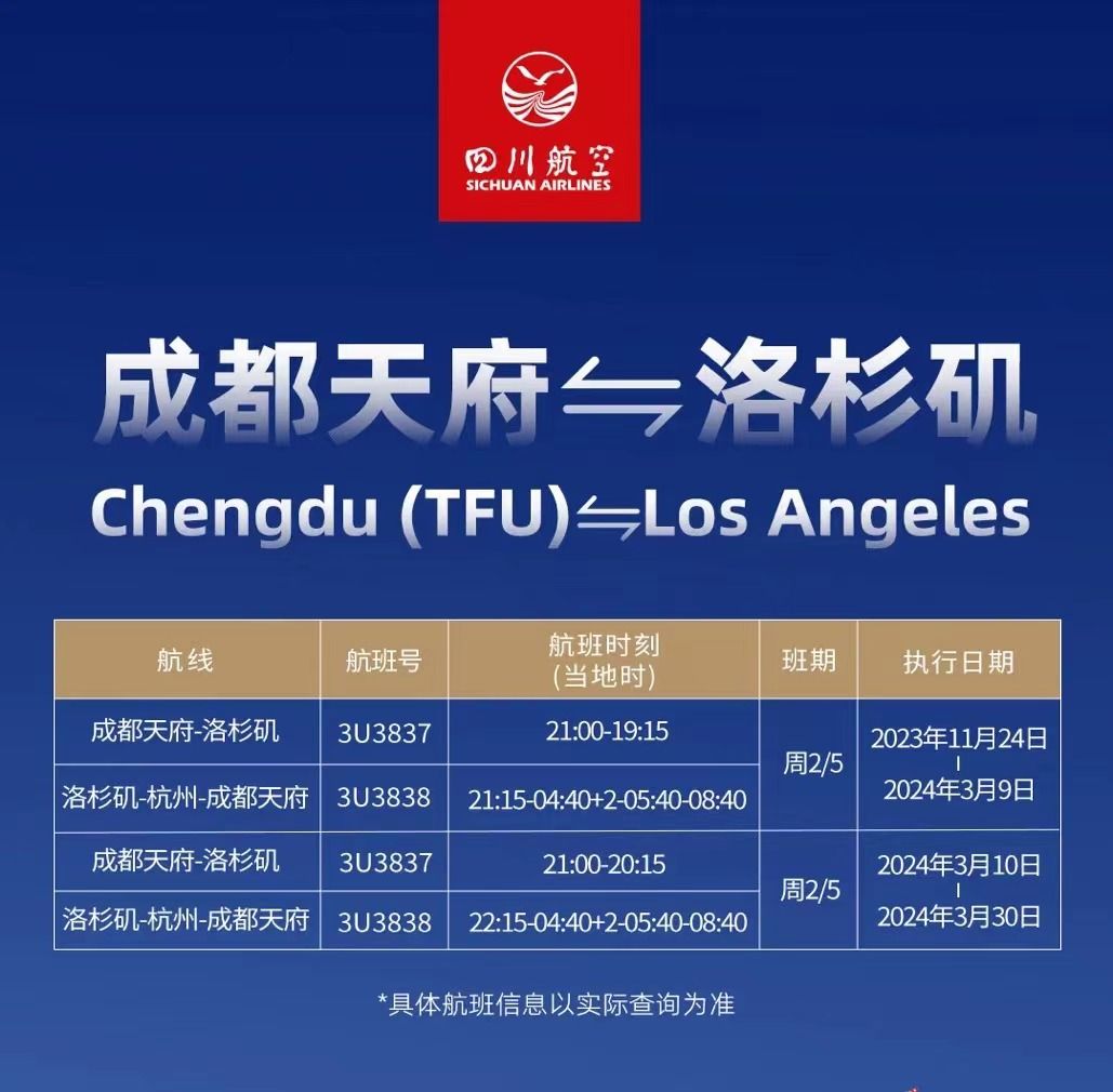 据了解,川航成都直飞洛杉矶航线的起飞时间为北京时间21时,洛杉矶当地时间19时15分到,单边飞行时长14小时15分;返程需经停杭州,当地时间21时15分起飞,北京时间8时40分(+2天)到,单边飞行时间为19小时25分钟(国际段)+1小时(国内段)。