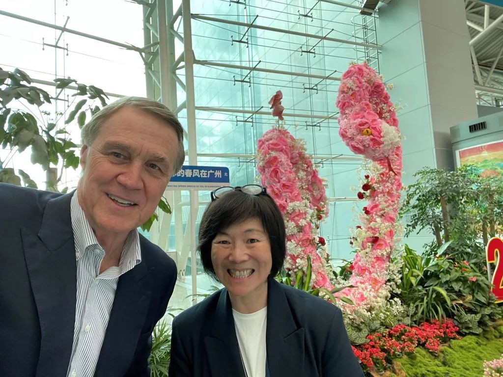 庞德伟大使在X/推特上说,“雷猴(你好),广州!这是我以美国驻华大使的身份首次来访。我期待与美国驻广州总领事馆紧密合作,让美国变得更安全、更强大、更繁荣。”图为大使与美国驻广州总领事高葆玲在机场的自拍合影。