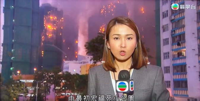 11月26日,香港大埔宏福苑发生五级火灾,TVB新闻台新闻主播陈嘉欣在现场直播报道该事件。