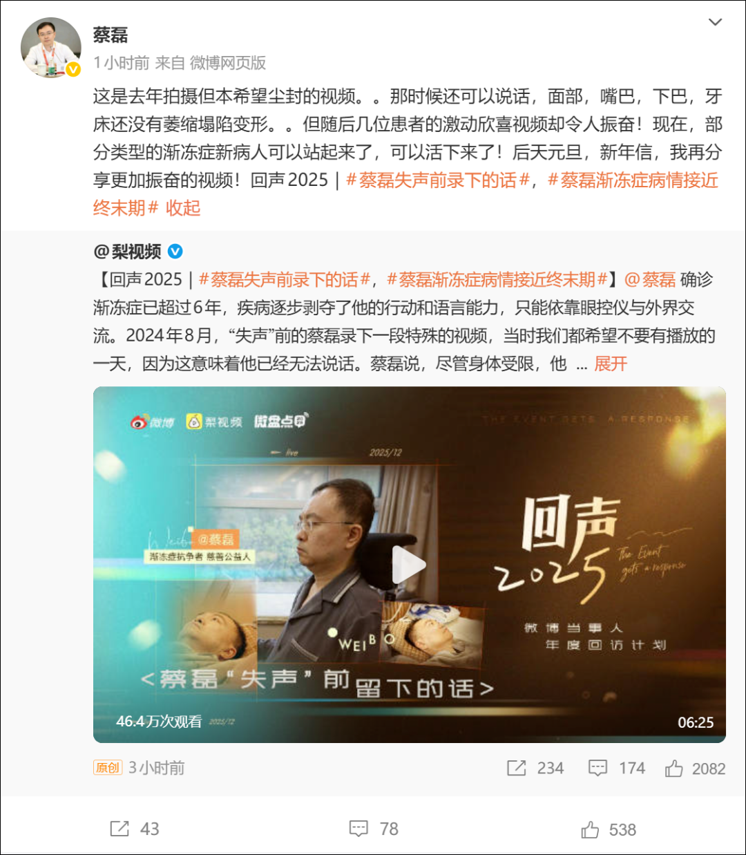 蔡磊在自己的社交账号也转发了这段视频,并表示:“这是去年拍摄但本希望尘封的视频,那时候还可以说话,面部、嘴巴、下巴、牙床还没有萎缩塌陷变形。”