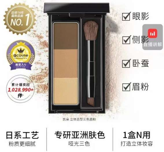 公開資料顯示,KATE誕生於1997年,憑藉高性價比和“No More Rules”的品牌理念,被譽為“平價日妝鼻祖”,在日本本土市場連續多年位居彩妝銷量冠軍。2010年正式進入中國市場後,其骨幹眼影、三色眉粉等產品銷量較高。