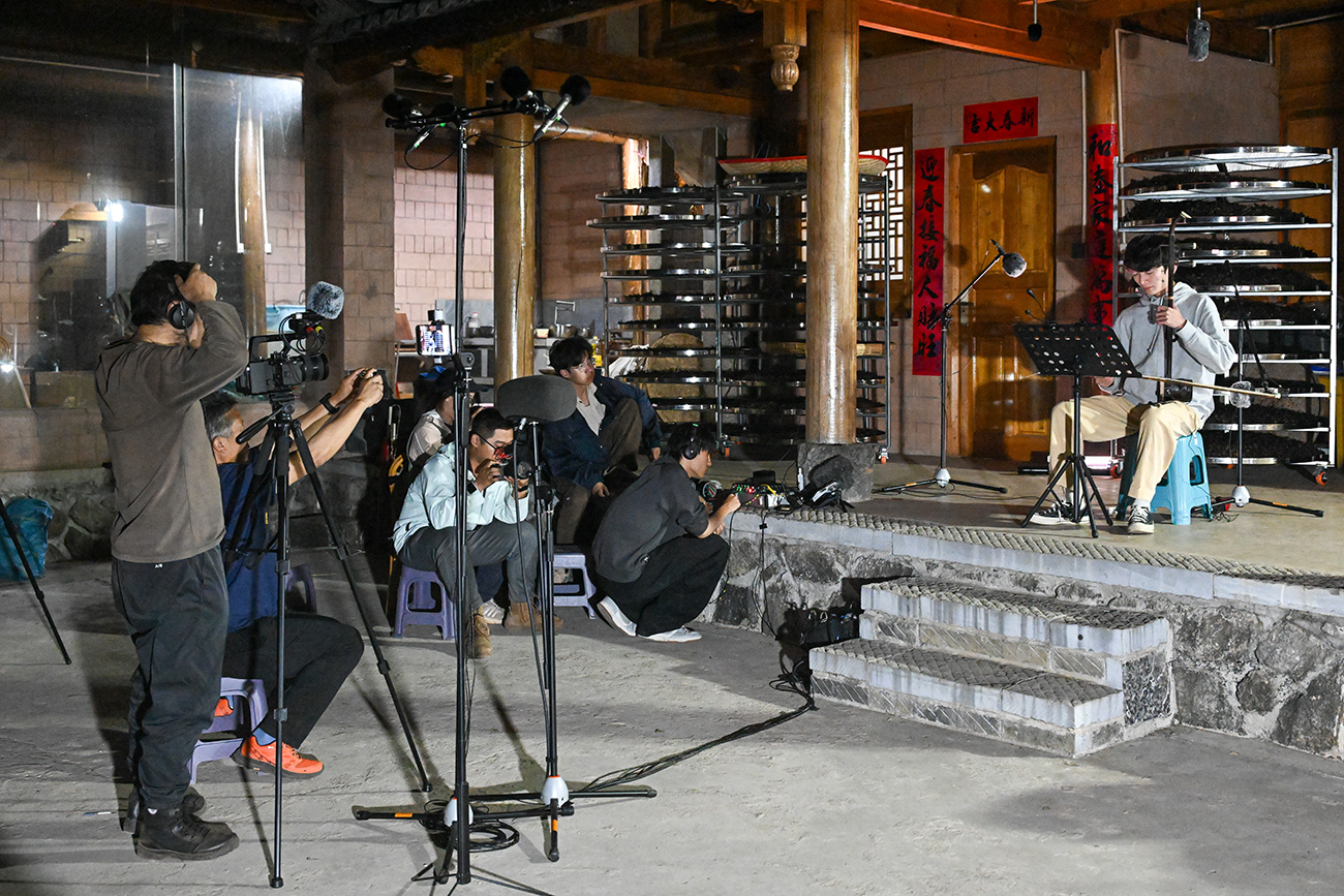 制茶间隙,宋文胜的几名台湾学生演奏起中阮、二胡与长笛。当云南民歌《小河淌水》在山间流淌,云南艺术学院的学生用摄像机与录音设备记录下音乐与自然共鸣的瞬间。