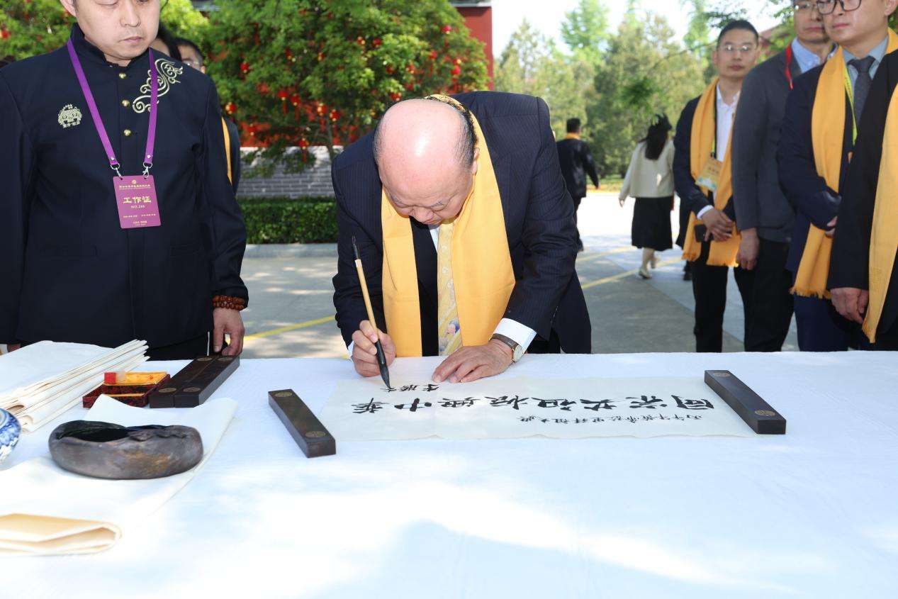 4月19日,丙午年黄帝故里拜祖大典在河南郑州新郑市举行。图为新党副主席李胜峰现场题字“同宗共祖振兴中华”。(图片来源:中新社)