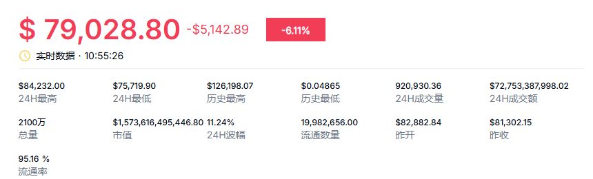 北京时间1日凌晨,比特币一度跌至75719美元/枚,为2025年4月以来的最低水平。1日10时55分,比特币回升至79028.8美元,下跌6.19%。