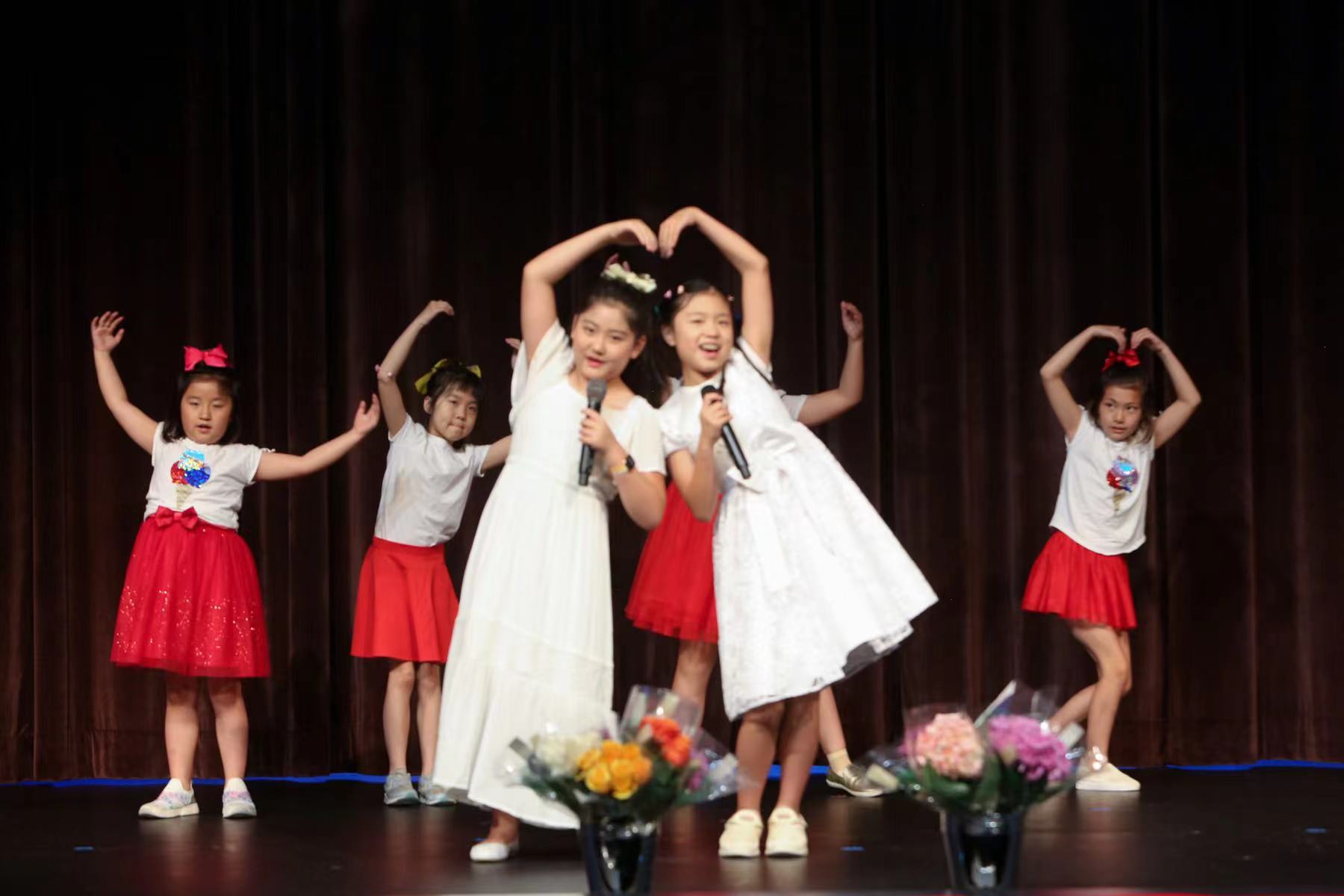 最后一个节目是由两位主持人敖雪和刘美含同学带来的二重唱《你笑起来真好看》,节奏欢快,加上一群孩子的伴舞,整个现场氛围都非常的快乐。两位小主持人经常参加学校及全美中文学校组织的演讲及主播活动,得到了很好的锻炼并多次获奖。