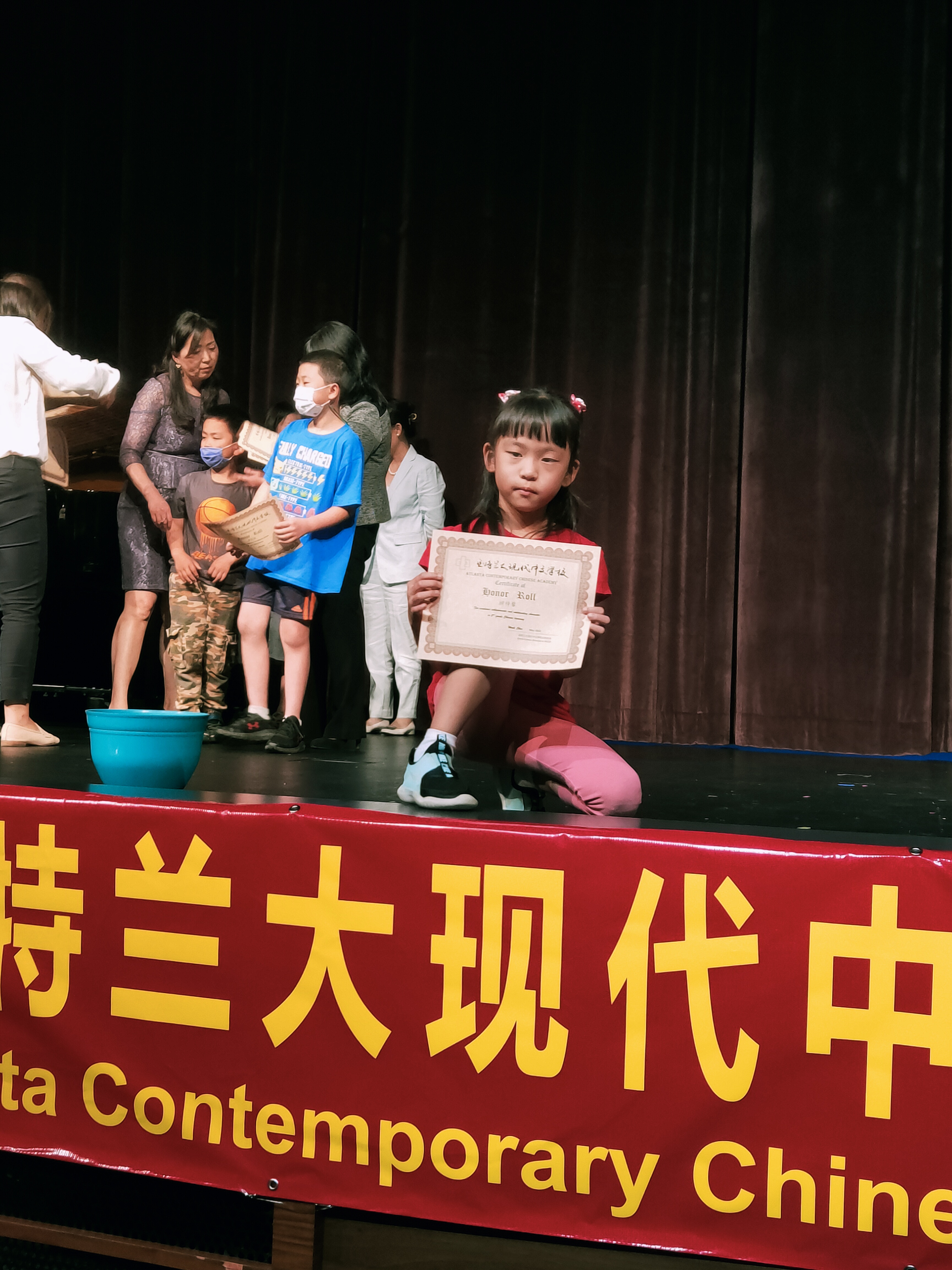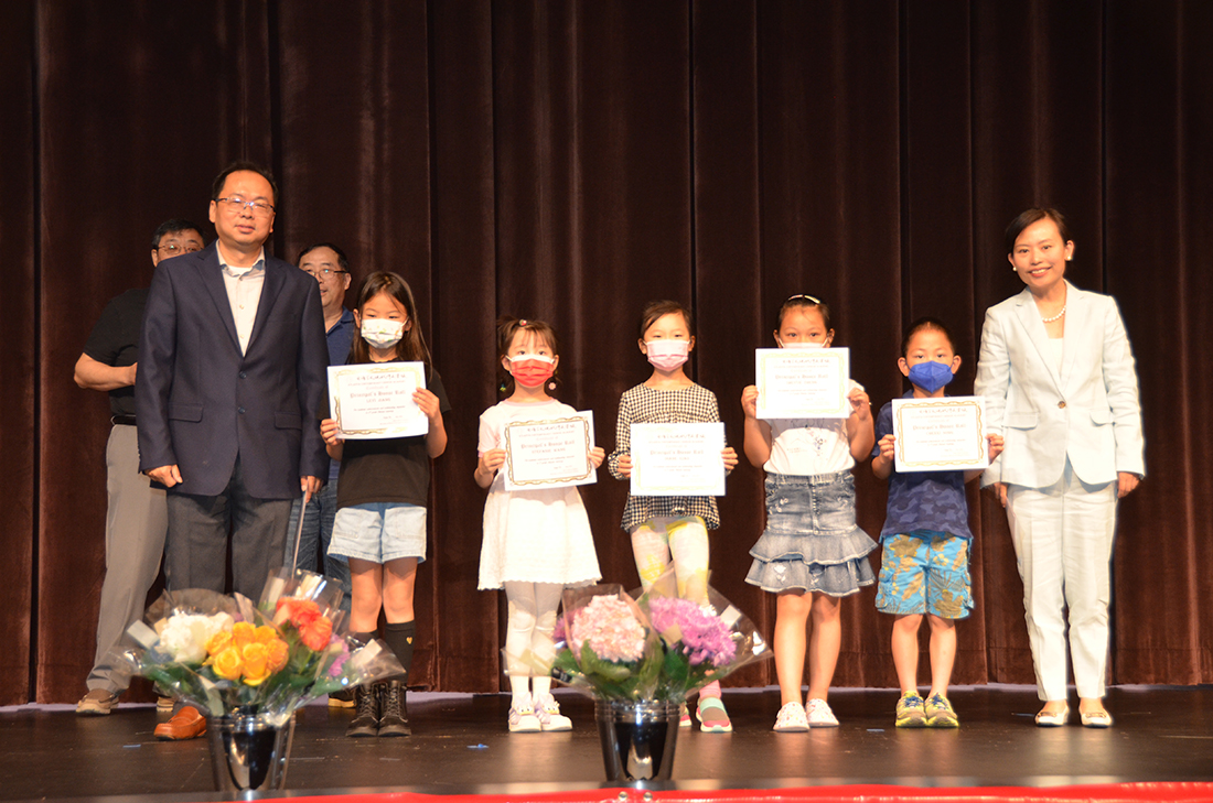 精彩的文艺表演结束之后,亚特兰大现代中文学校理事长李欣女士代表理事会致词。她首先祝贺毕业生们在疫情之下坚持学习中文并取得优异成绩表示祝贺!对校务和老师团队的努力工作和辛勤付出表示充分的肯定和感谢!对于一直陪伴和鼓励孩子们学习中文的家长们表示衷心的感谢!李欣女士特别指出,今年是现代中文学校建校三十周年,在此要特别感谢亚城各大社团及个人长期以来对于海外中文教育发展的支持!中文学校30年一路走来,凝聚了一代代的前辈们的无私奉献和付出,我们将继续努力更好地服务和回馈社区!随后,李欣理事长和其他四位理事(南校理事郑璐、北校理事朱爱芝、杨旻娥、西校理事顾秀华)一起为五家社团领导颁发卓越贡献奖的奖牌。他们是亚特兰大中国商会会长倪建先生、亚特兰大华人企业家俱乐部会长姜延先生、美中下一代基金会主席鲍俊涛先生、美中报导社长江维先生和新报社长David Yu先生。