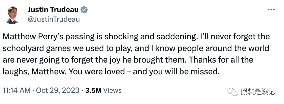 在马修·佩里去世的消息曝出之后,加拿大总理贾斯汀·特鲁多向他的前校友马修·佩里致敬,特鲁多总理在社交媒体上发帖称:“马修·佩里的去世令人震惊和悲伤。我永远不会忘记我们曾经玩过的校园游戏,我知道世界各地的人们永远不会忘记他给他们带来的快乐。谢谢你带来的所有欢笑,马修。你被爱着——我们会想念你的。”