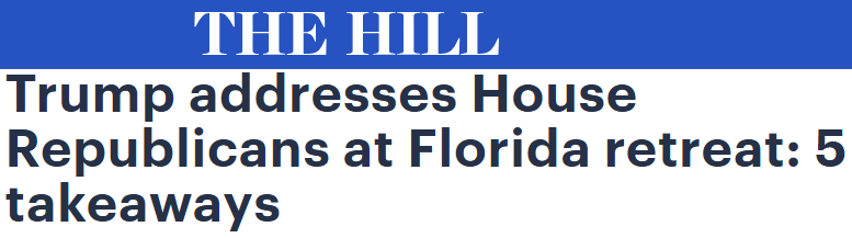 据国会山报报道 川普总统在对议员的年度政策会议上发表讲话,提出竞选第三任期,对中国一款新的人工智能应用程序发表评论,并敦促众议院共和党人团结起来,迅速推进他的立法优先事项。