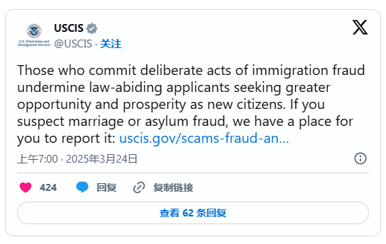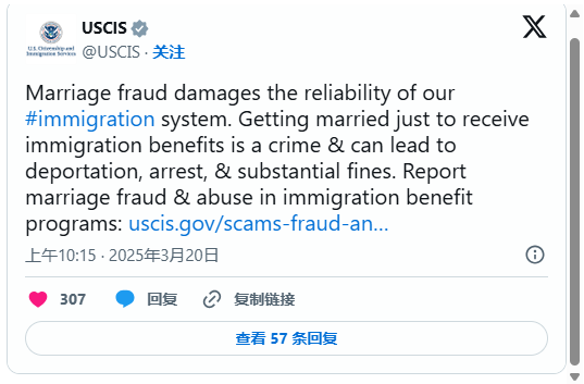 USCIS在X上发出警告,称这是一种“联邦犯罪”,以获取移民优势为目的的假结婚对移民体系有害,并将受到严厉处罚,如驱逐出境、逮捕和高额罚款。