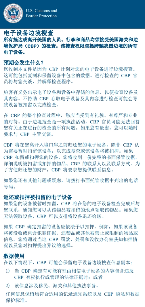 根据美国法律,美边境海关执法人员有权对所有入、出境人员进行检查,包括查验其个人信息、入、出境目的和携带物品等,无须事先申请搜查令。美边境执法人员无需怀疑即可搜查旅客的手机等电子设备,并可暂扣。