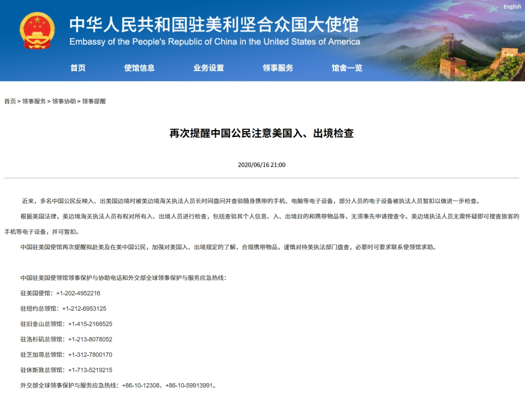早在几年前,中国驻美大使馆就曾发文提醒中国公民注意美国入、出境检查。