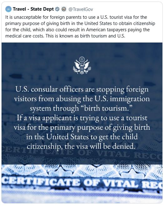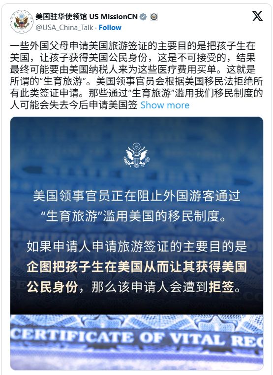 在社交媒体X上,大使馆引用了美国国务院领事事务局的一份声明,称如果申请人申请旅游签证的主要目的是企图把孩子生在美国,从而让孩子获得美国公民身份,那么该申请人会遭拒签。