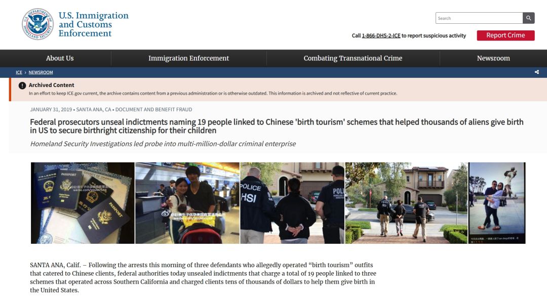 今年早些时候,美国移民及海关执法局(ICE)发布公告,公布了涉及“生育旅游”案件的起诉书,其中共计19人涉案。这些“月子中心”在南加州运营,专门针对中国客户,收取数万美元费用,帮助她们在美国分娩,让新生儿自动获得美国公民身份。