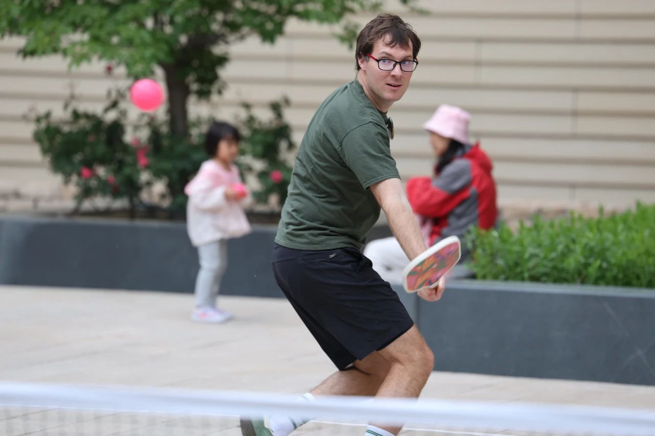 外交官周泾波(Steven Jones)带来了充满动感的匹克球演示,展示了这项融合羽毛球、乒乓球和网球元素的热门运动。