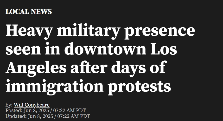 在美国海关执法局(ICE)对洛杉矶地区展开突袭并引发混乱之后,当地爆发破坏性示威活动。6月7日晚间,美国总统川普派遣国民警卫队增援洛杉矶县。截至6月8日周日凌晨,大批军事力量开始出现在洛杉矶市中心。