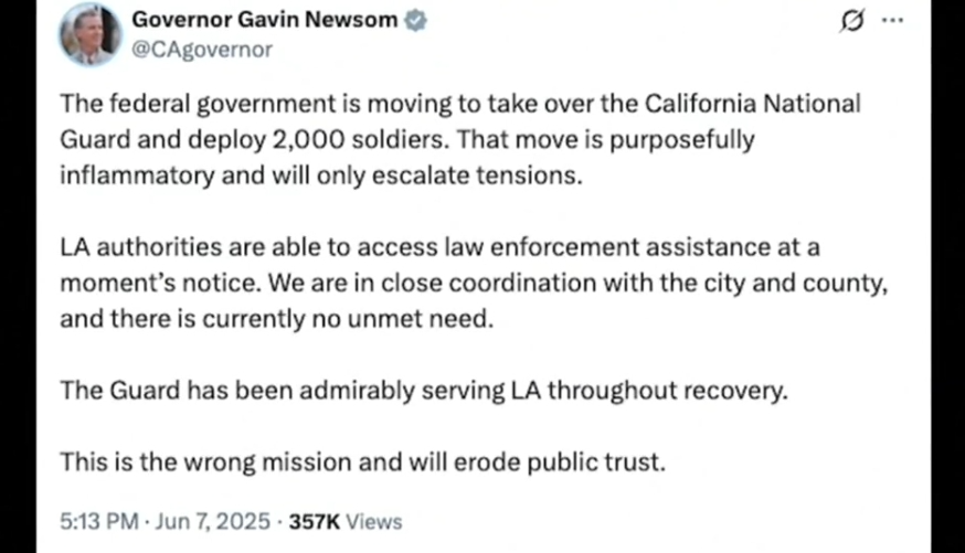 州长纽森在社交媒体上对川普政府此举表示强烈不满:“联邦政府正在接管加州国民警卫队,并部署2000名士兵。这一举动是故意煽动性的,只会加剧紧张局势。