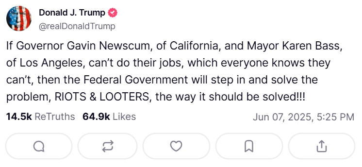 不足十分钟后,川普便在社交媒体上发文反击:“如果州长加文·纽森和市长凯伦·巴斯无法完成他们的工作——而大家都知道他们办不到——那么联邦政府将介入并解决问题,清理骚乱者与掠夺者。这才是解决问题的方式!!”