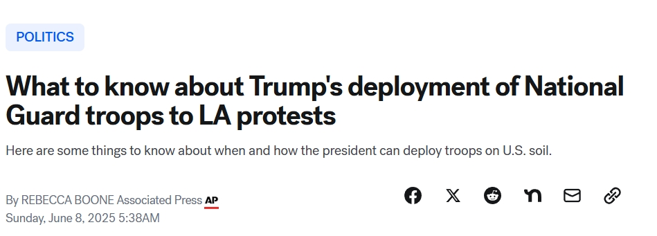 然而这次,川普的行动与州长纽森立场对立。在正常情况下,加州国民警卫队应由州长指挥。川普声称将部队联邦化是为了解决加州的“无法无天”。