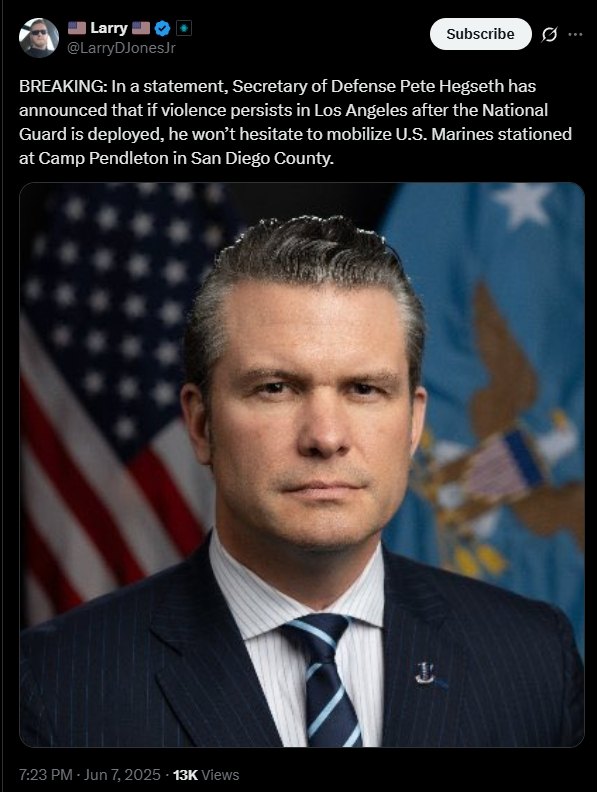 Pete在社交媒体平台X上写道,彭德尔顿营(Camp Pendleton)的现役海军陆战队处于高度戒备状态,如果暴力事件继续发生,他们也将被动员起来。