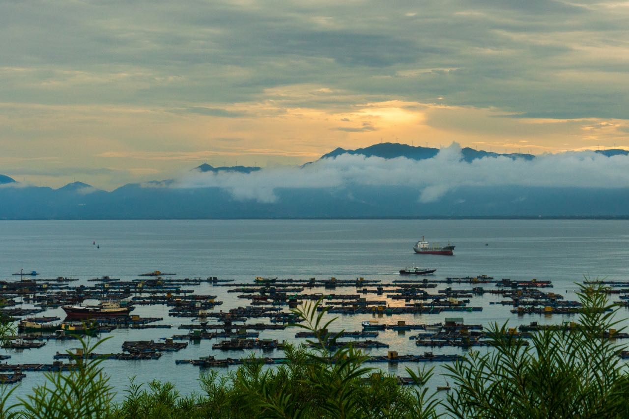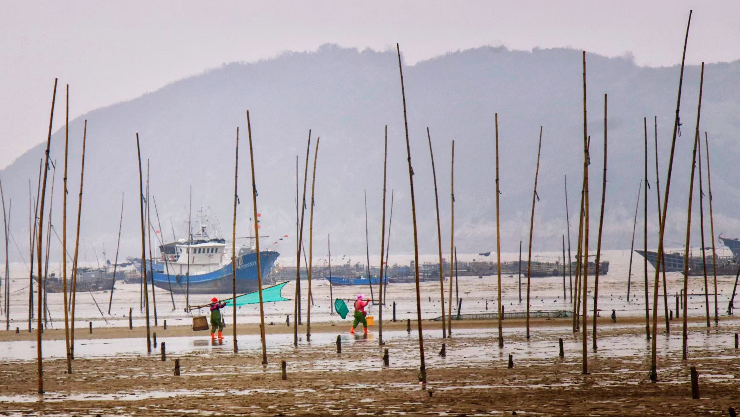 清晨的渔村,远山如黛、薄雾轻笼、水面如镜,犹如一幅天然的水墨画卷。