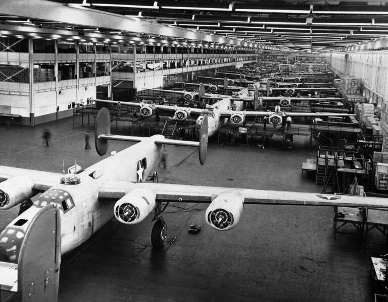 二战期间,美国进入了历史上最大规模的军事工业建设,比如飞机制造商从最初一次只能生产少量飞机发展到在装配线上大规模生产数千架飞机。不到5年的时间,飞机制造业在美国各工业领域的排名就从第41位跃升至首位。1939年美国军方飞机总量不足3000架,到战争结束时,美国已生产了近30万架飞机,其工业化程度大幅度提升。1939年时飞机生产厂基本采用单班生产方式,随着需求的跳跃式增加,工厂生产先是改为两班制,后来又改为三班制,除了传统上生产飞机的公司比如波音、洛克希德和道格拉斯飞机公司等外,连汽车公司也加入了生产飞机零部件和整机的计划,例如福特公司在密歇根州新建了威洛伦(Willow Run)工厂,制造B-24“解放者”轰炸机并在其他工厂组装飞机部件。