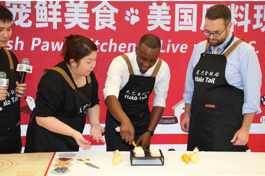 美国驻上海总领事馆代总领事莫达华先生到场支持,并与美国参展商互动,还携手美国农贸处白乐山主任参加了“宠鲜美食·美国原料现做秀”,用新鲜优质的美国食材烹制健康美味的宠物餐。